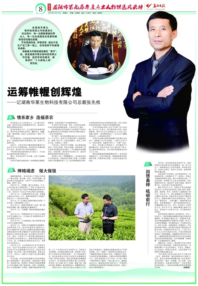 荣誉和媒体背后的幕后英雄。 可在茶园改造、种苗育苗、新品开发、生产加工第一线上,总有他那不知疲倦的身影。 他被誉为华莱快速发展的“推手”;他,就是湖南华莱生物科技有限公司总裁、益阳市政协委员、湖南茶叶“十大新锐人物”张先枚。