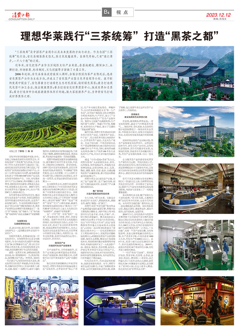 作为民族企业,理想华莱积极承担着兴盛黑茶产业、助力县域经济发展的重任,积极助推安化黑茶、思茅普洱茶产业快速发展。理想华莱以黑茶为核心,在助推乡村振兴的实践中,始终践行“绿水青山就是金山银山”的理念,助力实现“双碳”目标,打造“一二三产业融合、茶旅文体康融合、产城融合”的发展局面,用心打造茶产业链完整、茶文化体验独特、宜居宜业宜游的高质量发展新路子。