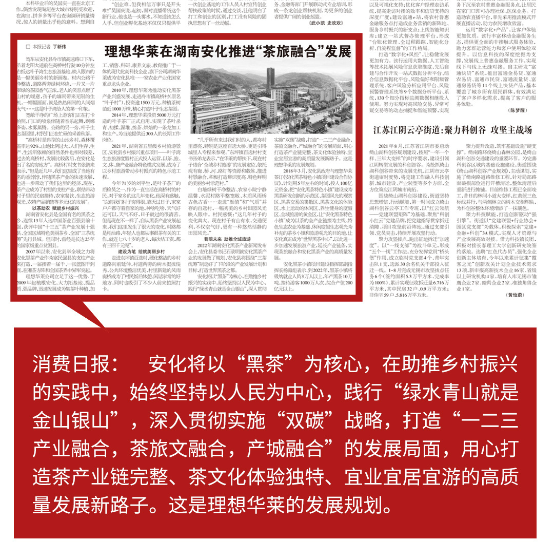 理想华莱公司立足于这一优势,于2009年起植根安化,大力拓基地、提品质、强品牌,迅速发展成为集茶叶种植、加工、销售、科研、康养文旅、教育推广于一体的现代化高科技企业,旗下公司湖南华莱成为安化县唯一一家农业产业化国家重点龙头企业。