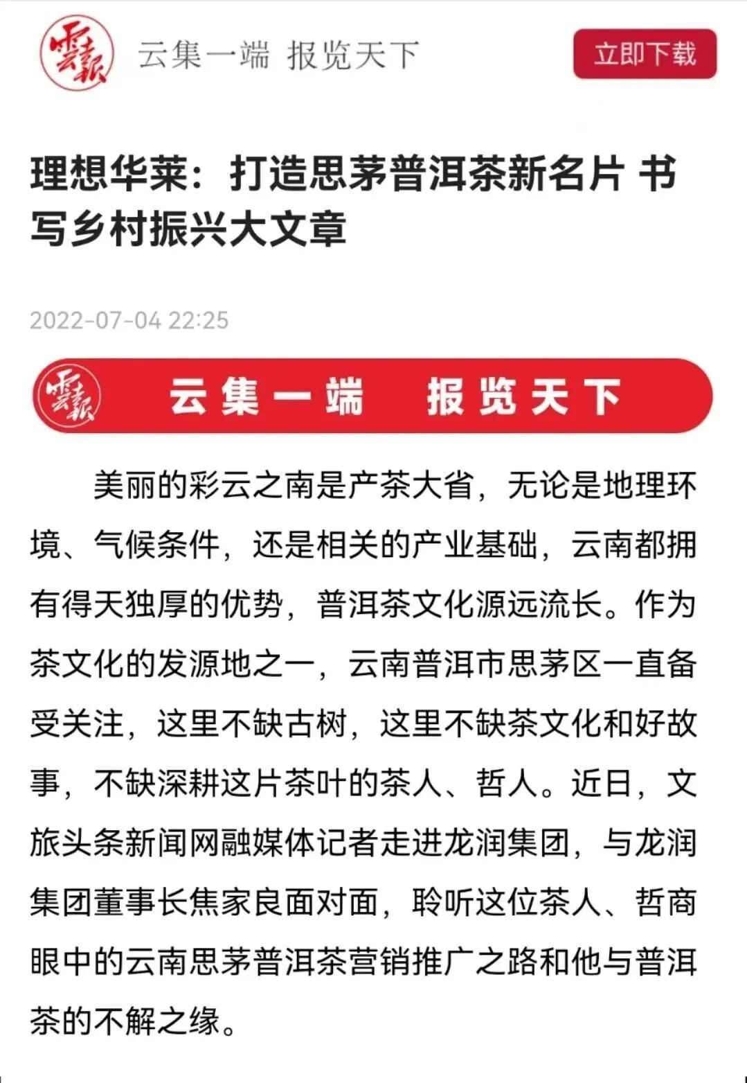 美丽的彩云之南是产茶大省,无论是地理环境、气候条件,还是相关的产业基础,云南都拥有得天独厚的优势,普洱茶文化源远流长。作为茶文化的发源地之一,云南普洱市思茅区一直备受关注,这里不缺古树,这里不缺茶文化和好故事,不缺深耕这片茶叶的茶人、哲人。近日,文旅头条新闻网融媒体记者走进龙润集团,与龙润集团董事长焦家良面对面,聆听这位茶人、哲商眼中的云南思茅普洱茶营销推广之路和他与普洱茶的不解之缘。