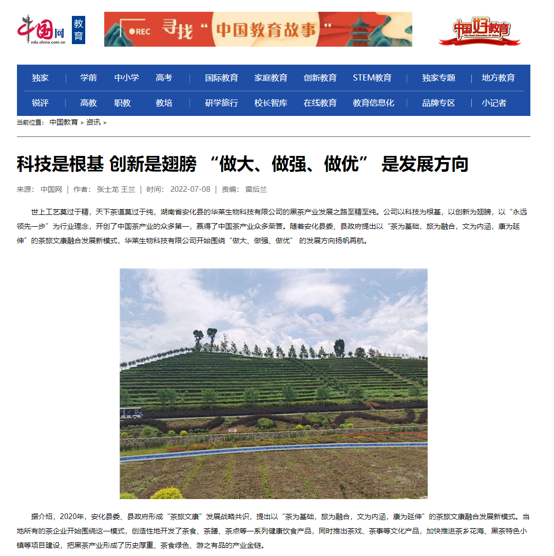 世上工艺莫过于精,天下茶道莫过于纯,湖南省安化县的华莱生物科技有限公司的黑茶产业发展之路至精至纯。公司以科技为根基,以创新为翅膀,以“永远领先一步”为行业理念,开创了中国茶产业的众多第一,赢得了中国茶产业众多荣誉。随着安化县委、县政府提出以“茶为基础,旅为融合,文为内涵,康为延伸”的茶旅文康融合发展新模式,华莱生物科技有限公司开始围绕“做大、做强、做优” 的发展方向扬帆再航。