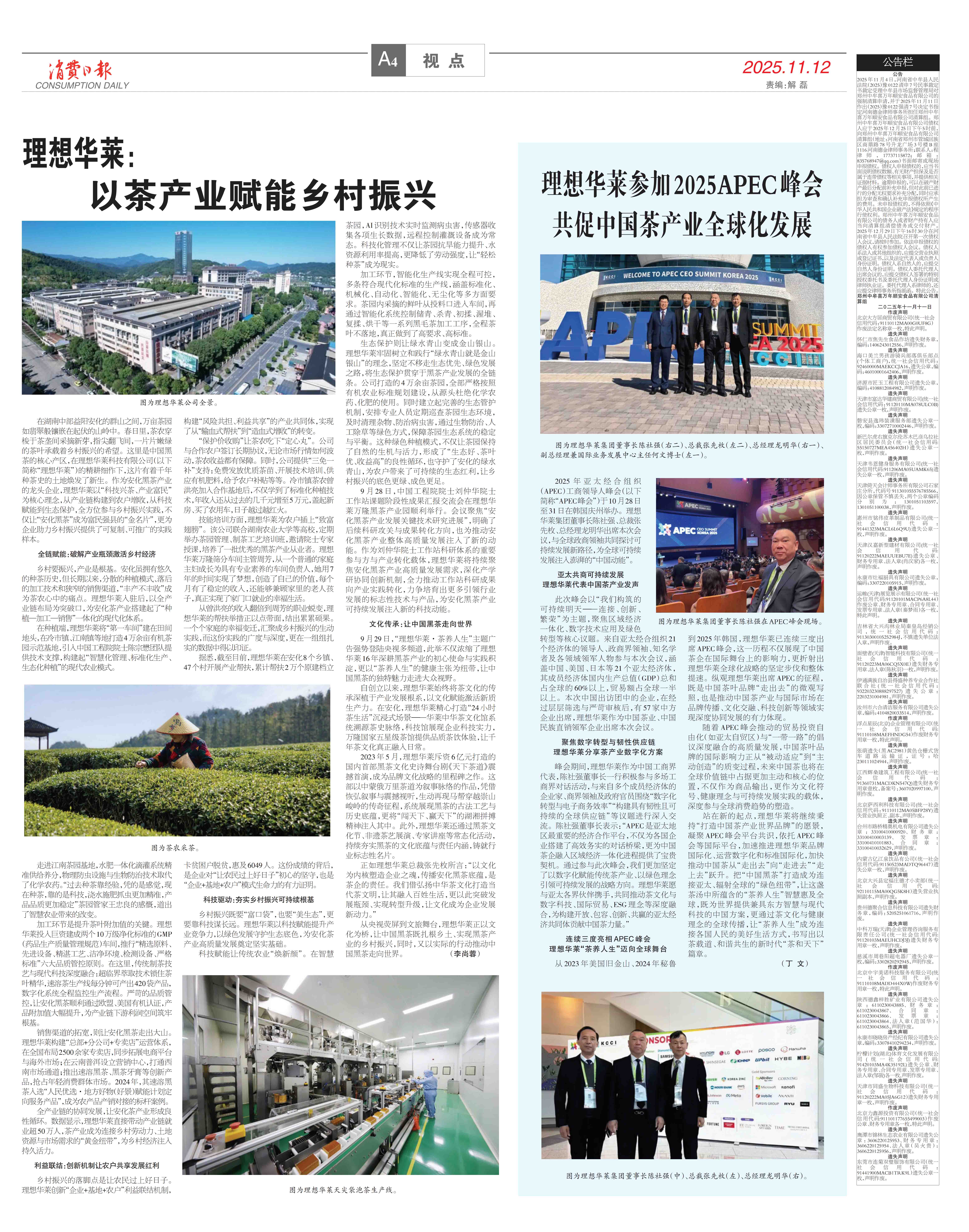 在湖南中部益阳安化的群山之间,万亩茶园如翡翠般镶嵌在起伏的山岭中。春日里,茶农穿梭于茶垄间采摘新芽,指尖翻飞间,一片片嫩绿的茶叶承载着乡村振兴的希望。这里是中国黑茶的核心产区,在理想华莱科技有限公司(以下简称“理想华莱”)的精耕细作下,这片有着千年种茶史的土地焕发了新生。作为安化黑茶产业的龙头企业,理想华莱以“科技兴茶、产业富民”为核心理念,从产业链构建到农户增收,从科技赋能到生态保护,全方位参与乡村振兴实践,不仅让“安化黑茶”成为富民强县的“金名片”,更为企业助力乡村振兴提供了可复制、可推广的实践样本。